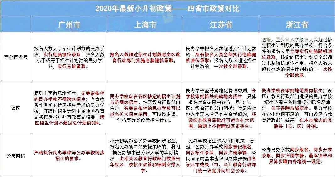 关于小升初政策,不管是哪个省市,最值得关注主要集中在三点: 1、报名人数超过计划招生数的私立校是否执行百分百摇号?报名人数未超过计划招生数的私立校,报名人员是否全部录取? 关于民办校百分百摇号,四省市的政策都比较一致:报名人数超过招生计划数时,全部实行电脑派位录取;报名人数未超过计划招生数的,实行全部录取。注意,这个摇号不是学校摇,是由审批地教育行政部门统一组织实施,具体操作规则由各地教育行政部门制定。 关于是否锁区 关于民办招生是否锁区,四地政策的大方向也基本相同:在学校审批机关的辖地内招生。此外,广州、上海两地明确表示,有寄宿条件的民办校可以扩大招生范围(即跨区招生);江苏、浙江两地则表示:由各地根据实际情况确定,但是不得跨市域招生。 在公民同招方面,除了“同步报名、同步录取”的要求,家长们最最关心的焦点就是:如果我去参加民办校的摇号,如果没摇上,那我还能回到对口公立校吗?也就是说,公办能否保底? ✔江苏:如果民办没有录取,公办对口又招满的情况下,孩子将可能面统筹,当然具体的细则还等官方发布。 ✔上海:如果报了民办没有摇中,就回到公办的招生序列,只不过同类排序靠后。这里要提醒下,摇中后放弃的等同于没有摇中,也回到公办排序靠后统筹录取。 所以家长们要想清楚了,如果自己对口的公办学校本来就不错,相当热门,报名民办一旦最终摇号失利,可能就进不了原来对口的那所公办学校了。因为根据同类排序靠后的原则,你的入学次序在最后,万一前面人户一致等优先次序招满了,就进不去,只能接受区里的调剂。所以说要承担一定风险的。对于那些原本对口的公办学校不那么热门的,倒是影响不会太大,反正回得去。 ✔广州:目前没有具体说明。 ✔江苏:民办九年一贯制学校其初中招生在保证小学直升需求后仍有余额且多余名额少于报名人数的,也要采取电脑随机派位方式录取。 ✔浙江:九年一贯制学校的小学部学生可以直升其初中部。民办九年一贯制学校其初中部招生名额多于小学部直升名额的,多余的名额按民办学校招生录取规则面向审批地统一招录。 ✔上海:民办一贯制学校可设置初中阶段本校免试直升计划和校外招生计划。如本校直升意愿人数小于或等于免试直升计划数,可全部直升;如本校直升意愿人数大于免试直升计划数,将由区教育行政部门实施电脑随机录取。 ✔广州:九年制学校和十二年制学校(小学、初中为同一办学许可证或在同一用地红线范围内的学校)初中招生时,应首先通过直升或电脑派位方式招收本校自愿报读初中的小学毕业生,具体办法由各区制定;剩余的招生计划应公开报名。 综上,九年制一贯小学、初中的民办学校受到的政策影响会比纯初中略小。 新政一出,大家也比较关注各地的外校是否会摇号。 ✔南京:江苏教育厅文件中无相关政策明示,南京外国语学校如何招生成了一大悬念。政策要求民办通过派位招生,但是南外不是民办。政策要求公办根据划定的学区招收学生,但是南外没有学区。因此,南外如何招生暂不确定。 ✔杭州:杭州外国语学校维持往年政策不变,保住了自己的招生优势。 ✔上海:上海的摇号针对民办学校,市直属的学校均为公办(包括外校),如果不出意外,应该还是学校自主选拔。 ✔广州:广州外国语学校因为新政沦陷,全部摇号入学。 综上,对于其他城市小升初新政, 小编已经给大家划出了重点! 最后贴一张2020年上海市初中报名入学流程 图片解释更清晰☟